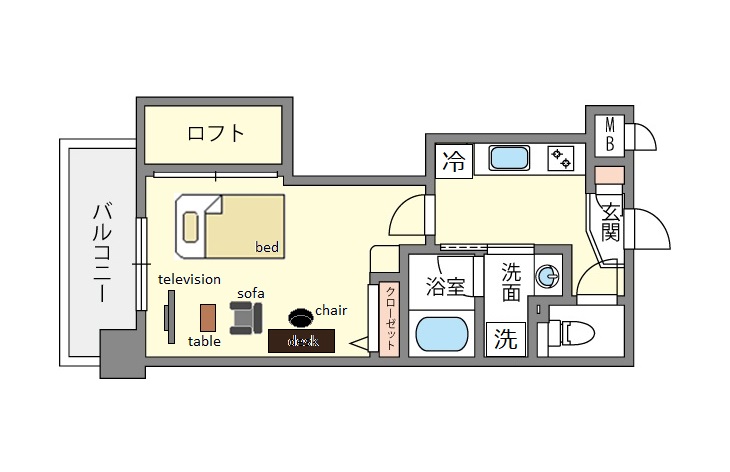 | 家具 | イス,カーテン付き,テーブル,デスク、テレビ台、ソファー |