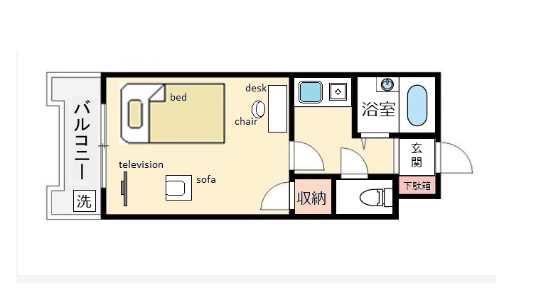 | 電化製品 | テレビ,ミニ冷蔵庫,洗濯機,掃除機,電気ケトル,ドライヤー |